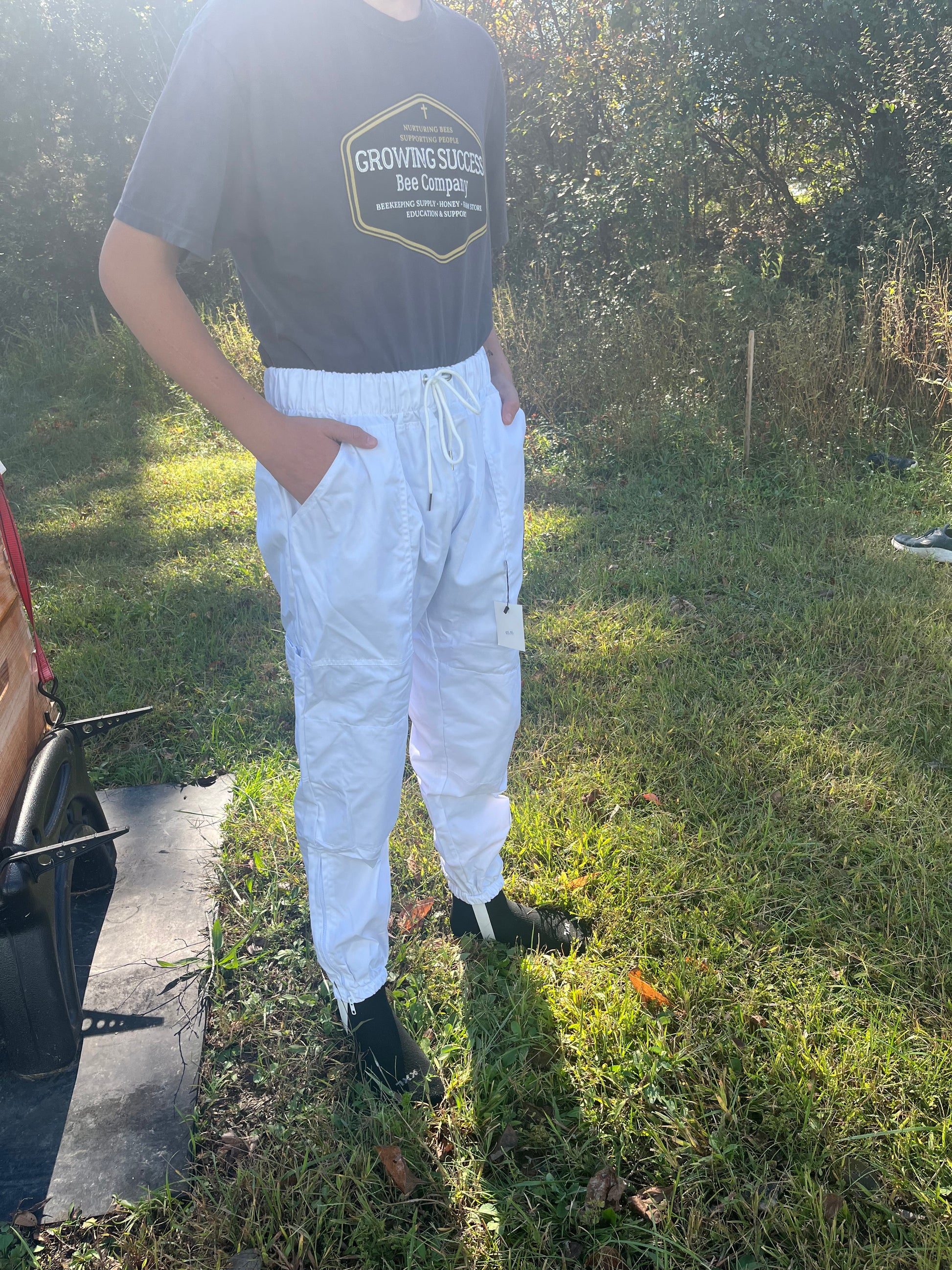Beekeeping pants are a cotton-poly blend.  They feature an elastic waist and legs with an elastic loop. They have side pockets and a drawstring at the waist. Please check our size chart before ordering.